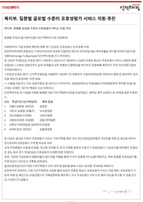 [정책브리핑]복지부, 질환별 글로벌 수준의 유효성평가 서비스 지원 추진