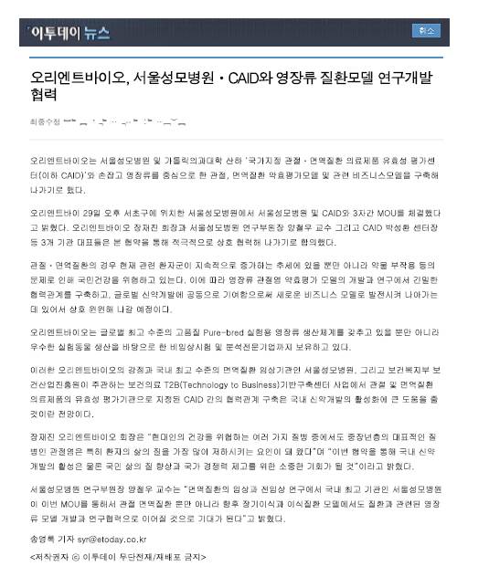 [이투데이] 오리엔트바이오, 서울성모병원ㆍCAID와 영장류 질환모델 연구개발 협력