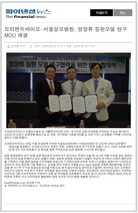 [파이낸셜뉴스]오리엔트바이오-서울성모병원, 영장류 질환모델 연구 MOU 체결