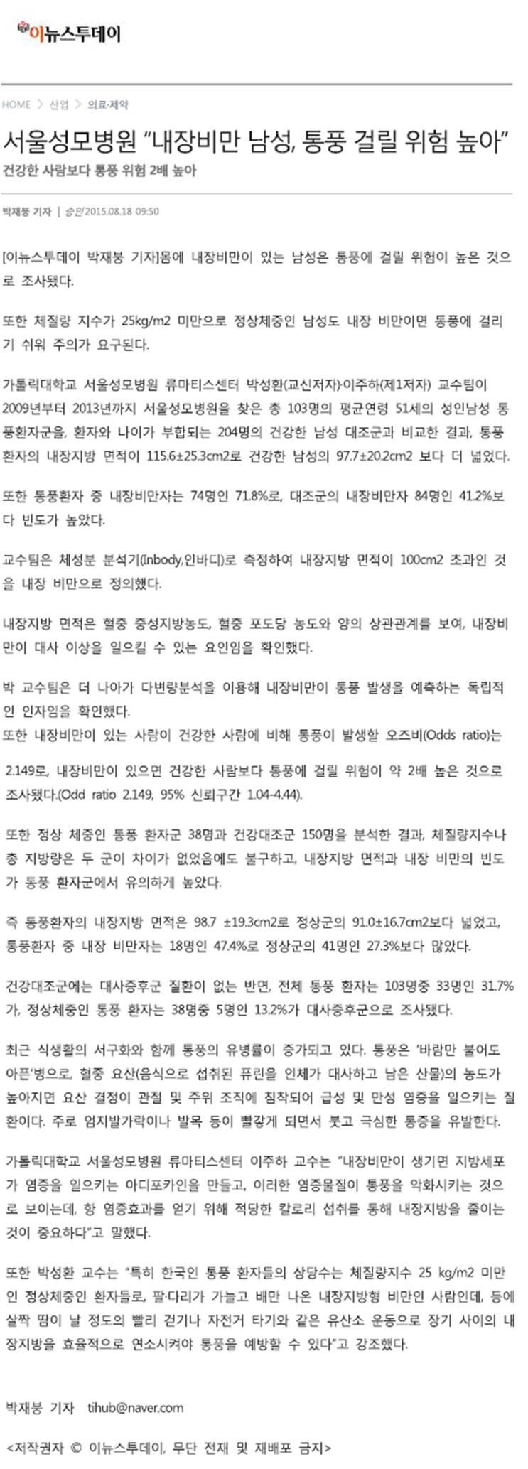 [이뉴스투데이] 서울성모병원 “내장비만 남성, 통풍 걸릴 위험 높아”건강한 사람보다 통풍 위험 2배 높아